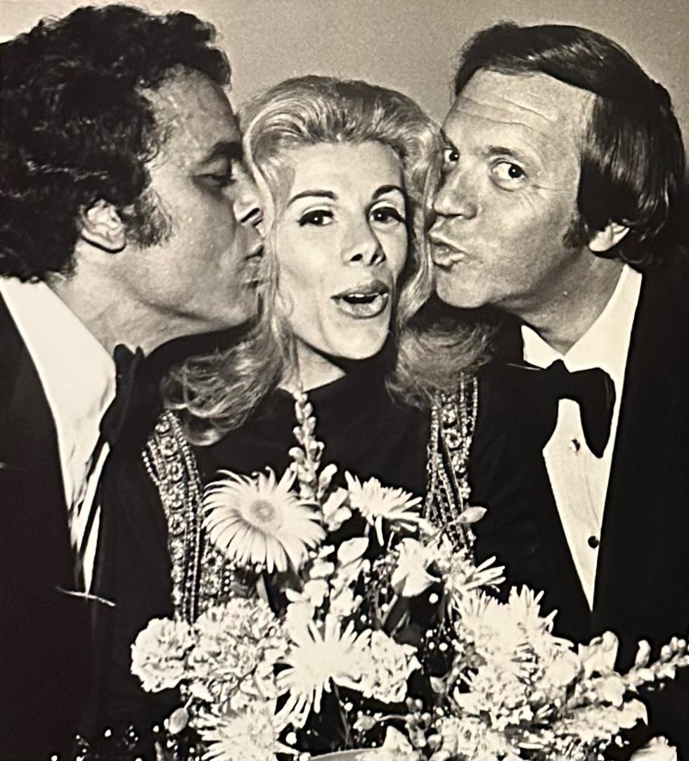 1971 | JOAN RIVERS IS SOUNDLY KISSED BY JULIUS LA ROSA AND MORTY GUNTY AFTER THEIR OPENING AT WESTBURY