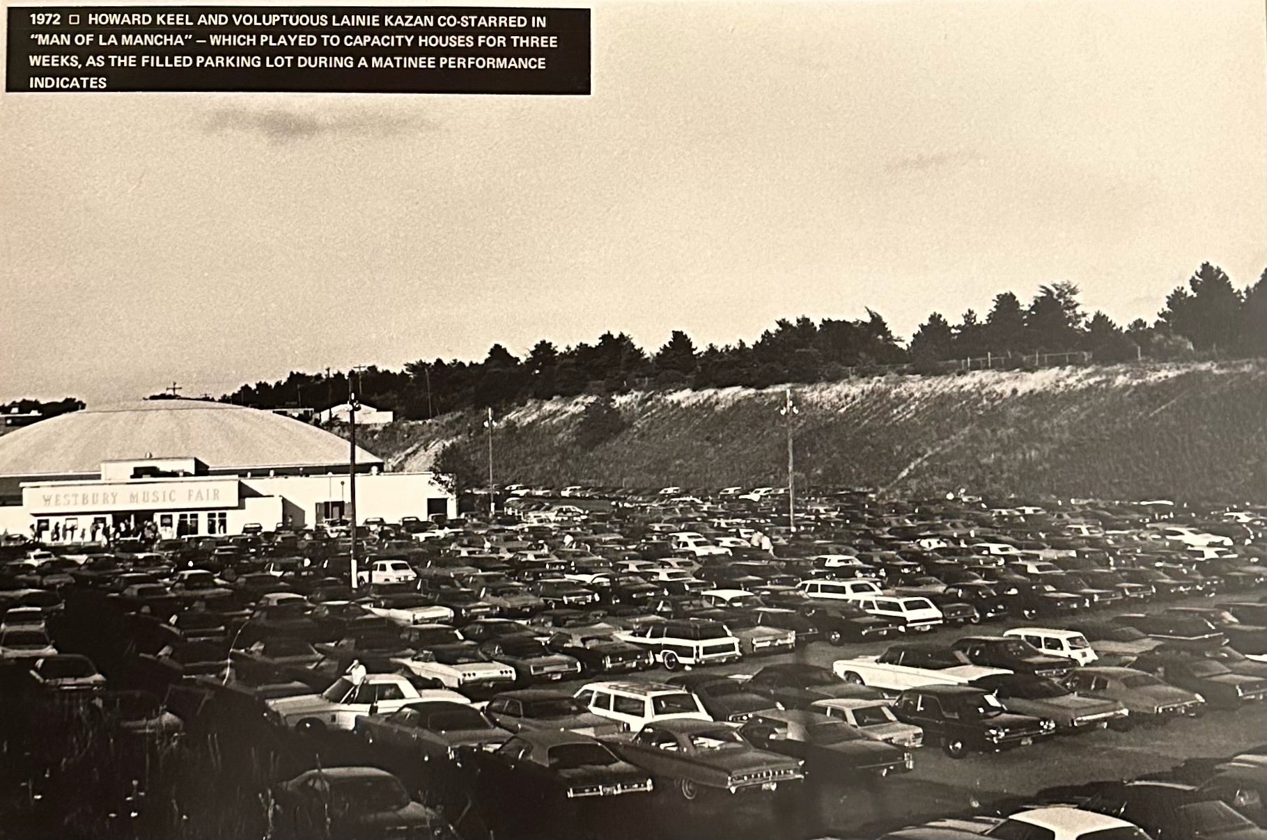 1972 | HOWARD KEEL AND VOLUPTUOUS LAINIE KAZAN CO-STARRED IN "MAN OF LA MANCHA" - WHICH PLAYED TO CAPACITY HOUSES FOR THREE WEEKS, AS THE FILLED PARKING LOT DURING A MATINEE PERFORMANCE INDICATES